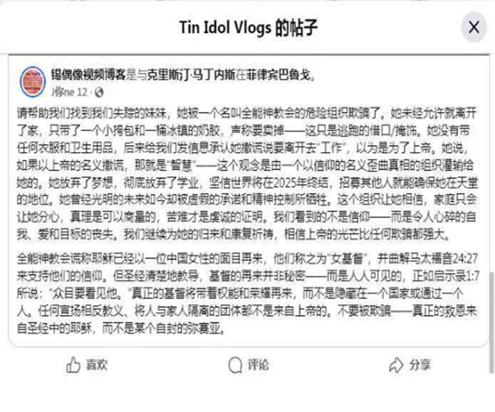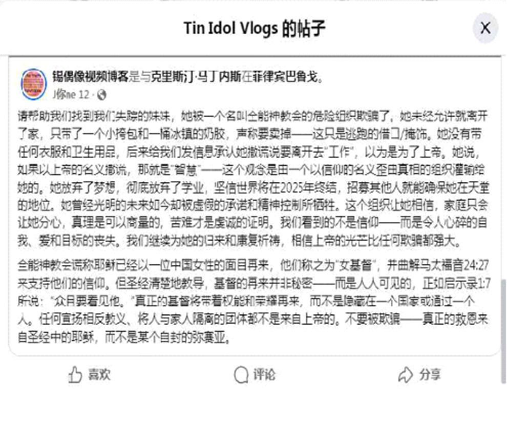 今年6月12日、フィリピンのネットユーザーであるティンは、自身のSNSアカウント「ティン・アイドル(Tin Idol Vlogs)」を通じ、フェイスブックのグループ「フィリピン・ニュース(Philippine News)」に人探しを求める投稿を行い、ミカの捜索への協力を呼びかけた。投稿には、ミカがカルト教団「全能神」の信者に唆されて学業を放棄し、家を飛び出した経緯が記されていた。さらに、「『天国での席』を得るためには家族を犠牲にしなければならないと言い含められ、2025年に世界が終焉を迎えると信じ込まされていた」という。