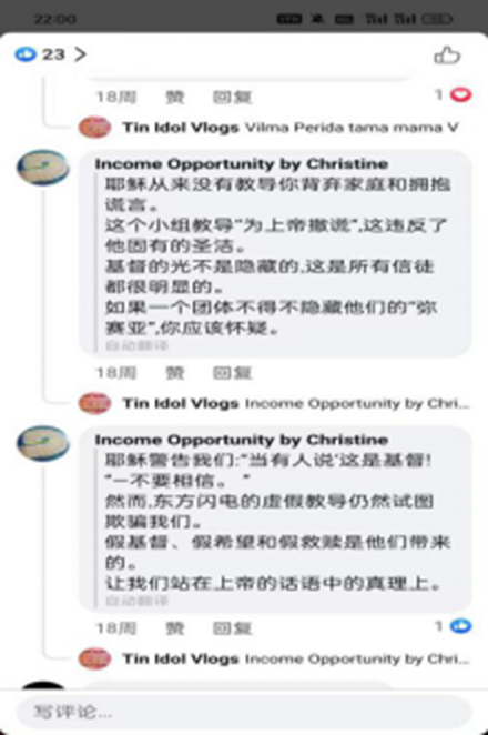 ▲フェイスブックグループで交わされるカルト教団「全能神」についての熱烈な議論(原文は英語、日本中国語は機械翻訳によるもの)